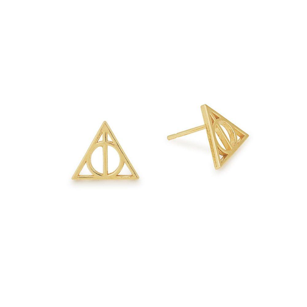 These 14kt Gold plated earrings feature the symbol of the Deathly Hallows for all those who seek to conquer death.